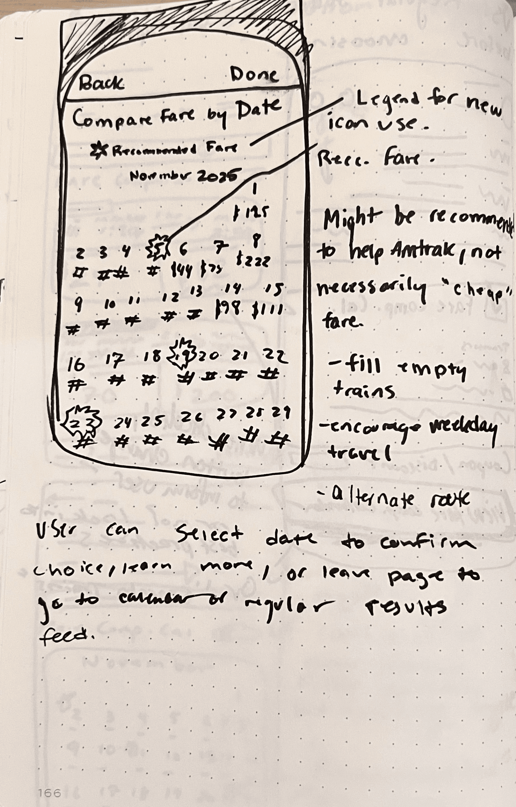 Early sketches mapped out a full-month calendar embedded within the date picker, displaying lowest fares below date. Iterative wireframes evolved, app screens reflecting Amtrak’s brand. Initial concepts tested “recommended” labels, but revisiting initial research, and user needs confirmed a desire for straightforward fare visibility instead.