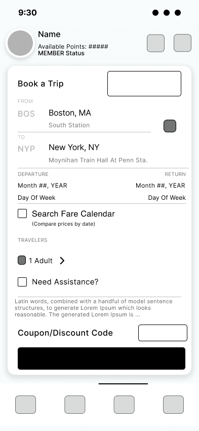 Sketching helped me plan design implementation into existing App flows, easily scaling up to High-fidelity as the design system already existed, I just had to follow as closely as possible, This was a strong challenge of the project, working with unavailable assets, and without the Amtrak team or stakeholders' input, but I was able to use Figma plugins and get user validation which aided in the attempt to be pixel perfect.