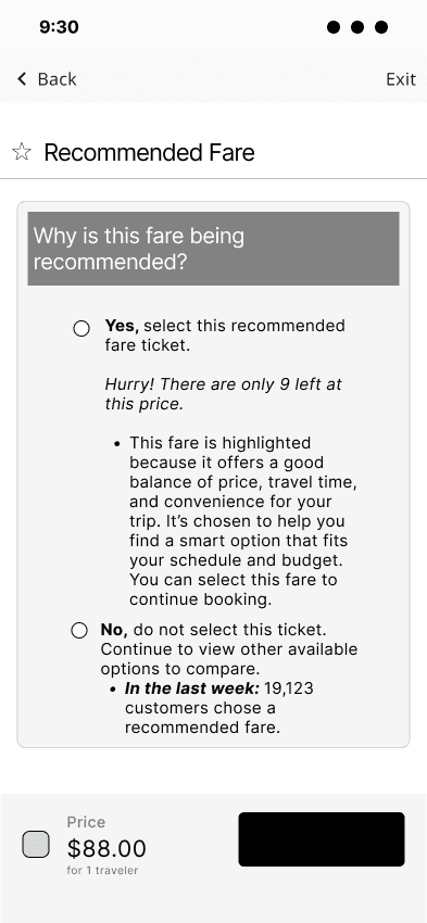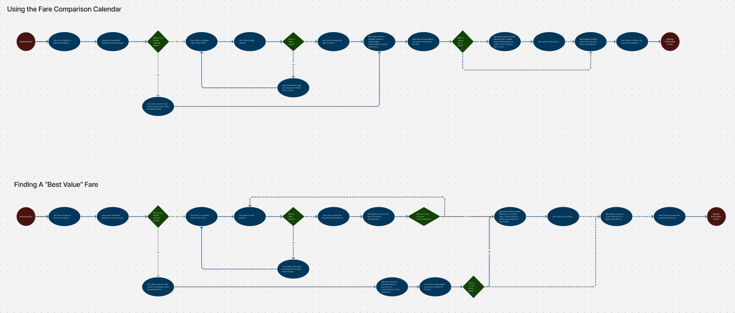 Two flows were explored, but early design work and research showed users preferred transparent fare comparison over recommendations, so design focused solely on the fare calendar experience.