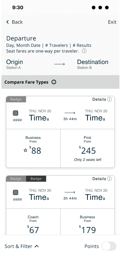 Feedback emphasized the calendar’s native feel and confidence-building visual fare display. Iterations polished filter/sort options, fine-tuned consistency, and aligned screens with close-to-exact Amtrak’s design system. The clickable prototype, built in Figma, showcased final iteration—offering extensive price visibility with seamless fit into the booking workflow.