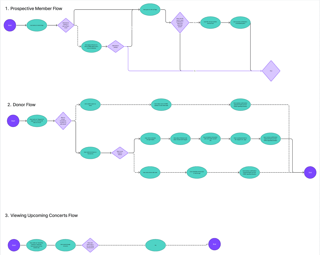 Using interview insights and tree testing, I created a simplified sitemap to improve navigation and content clarity. Key areas like donations, concerts, and joining the ensemble were reorganized to reduce clutter and make important actions easier to find, especially on mobile.