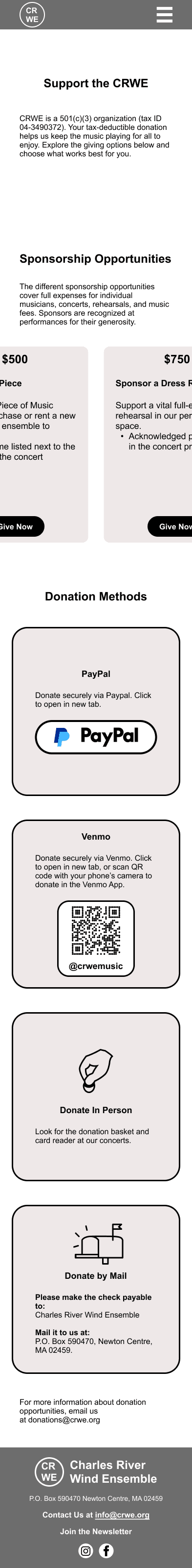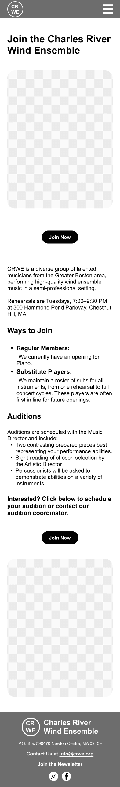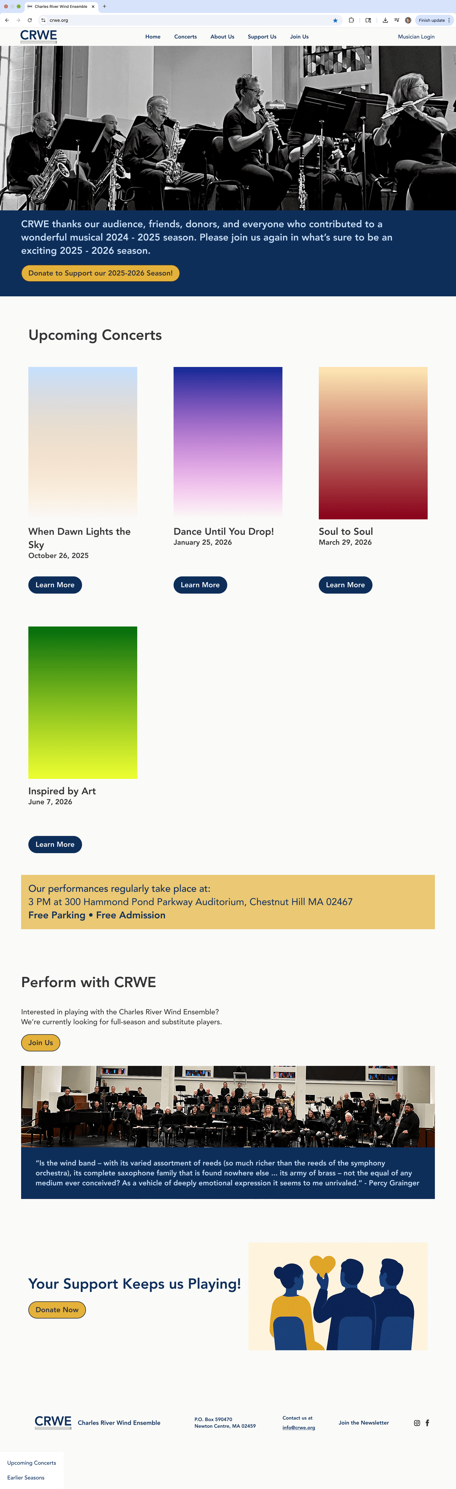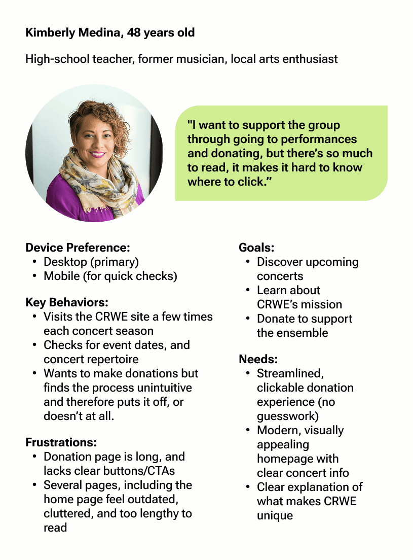 The Charles River Wind Ensemble (CRWE) is a nonprofit musical group with over 26 years of history, serving musicians, board members, audiences, donors, and prospective members. Their website was outdated, difficult to navigate, and did not clearly communicate key information or calls to action.