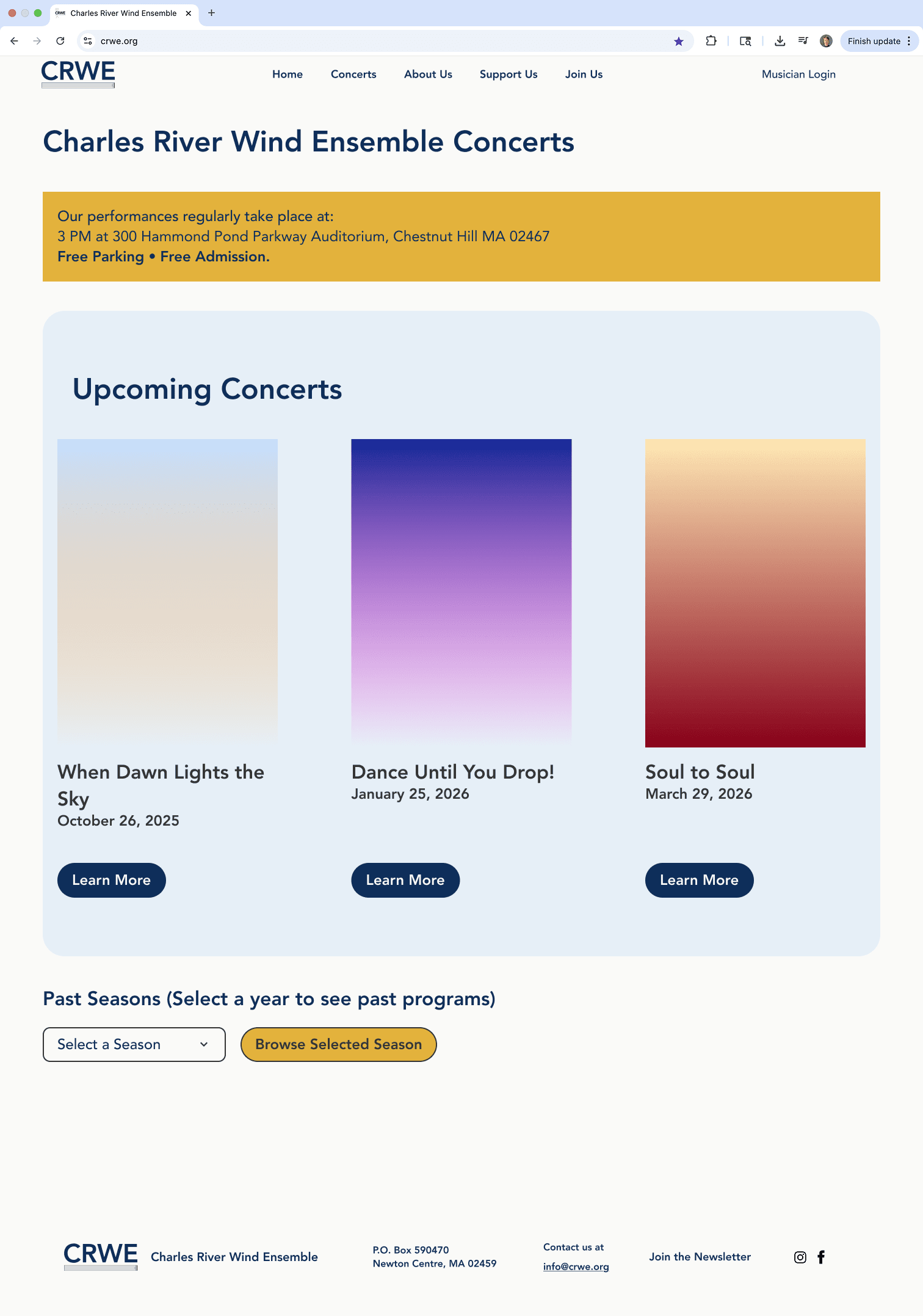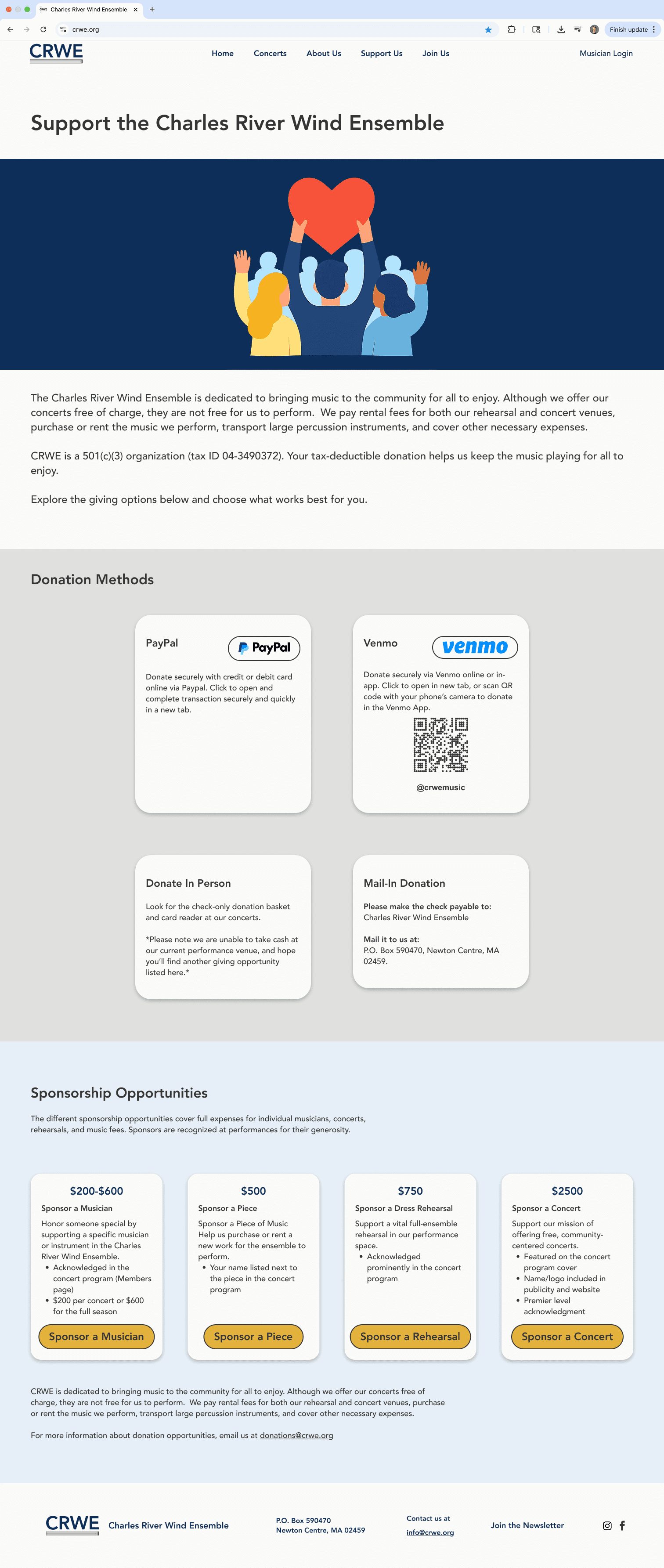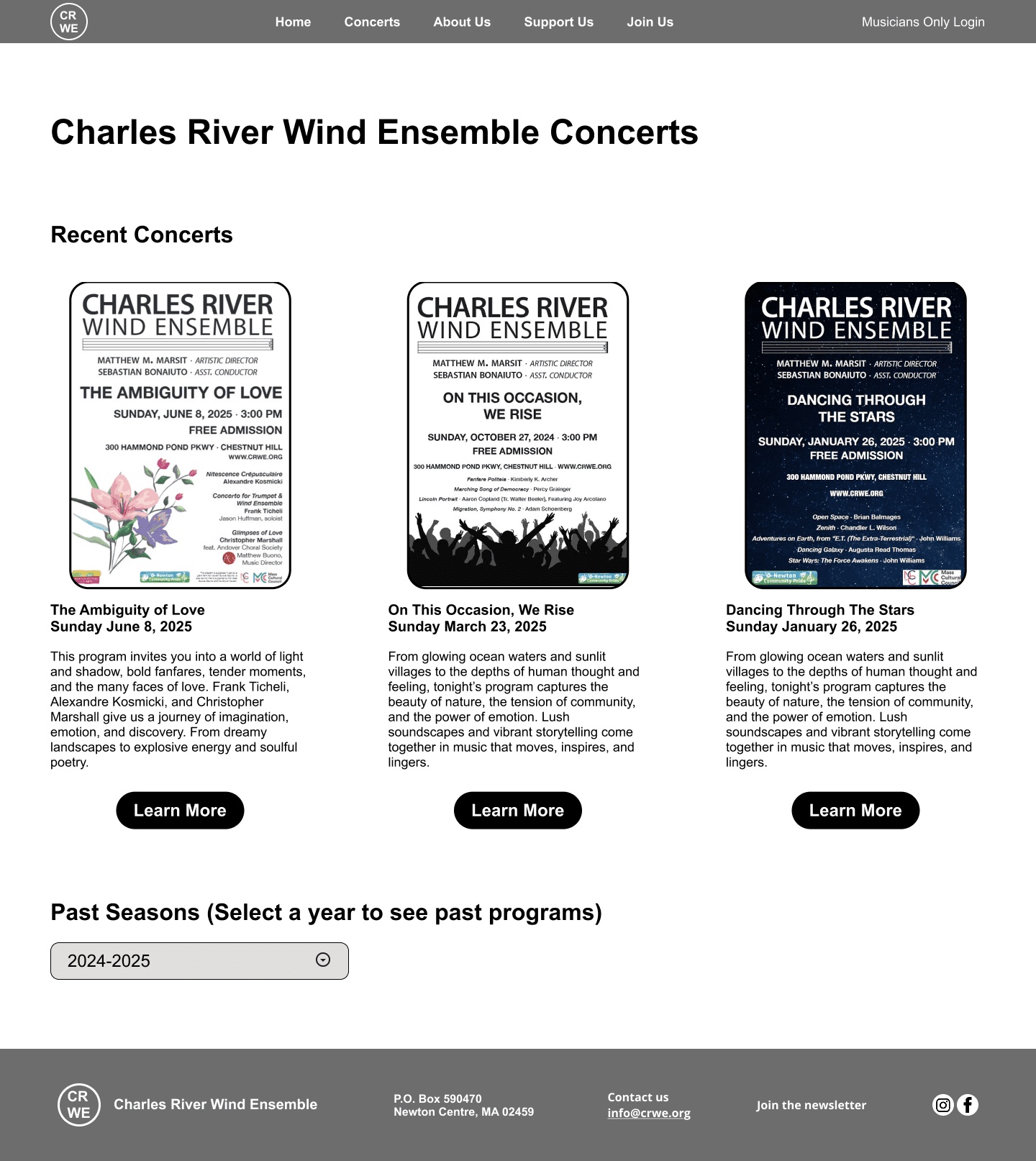 The Charles River Wind Ensemble (CRWE) is a nonprofit musical group with over 26 years of history, serving musicians, board members, audiences, donors, and prospective members. Their website was outdated, difficult to navigate, and did not clearly communicate key information or calls to action.