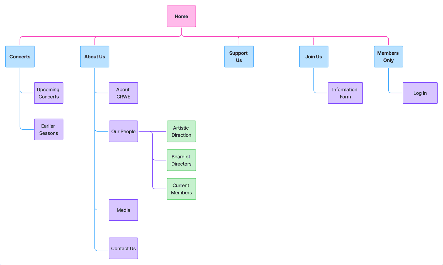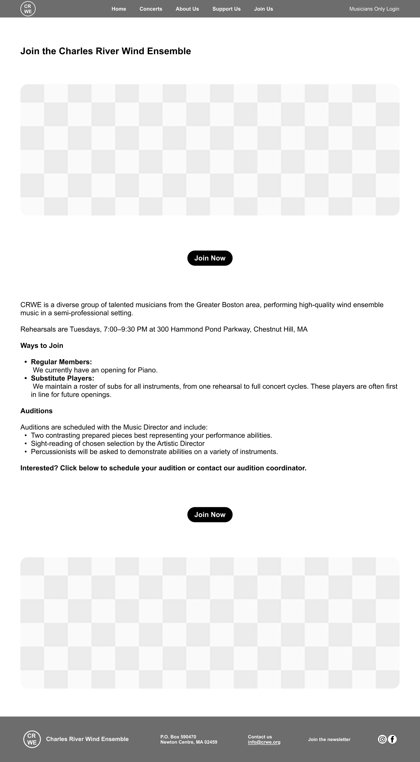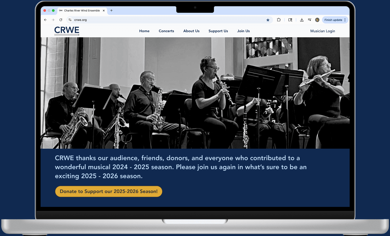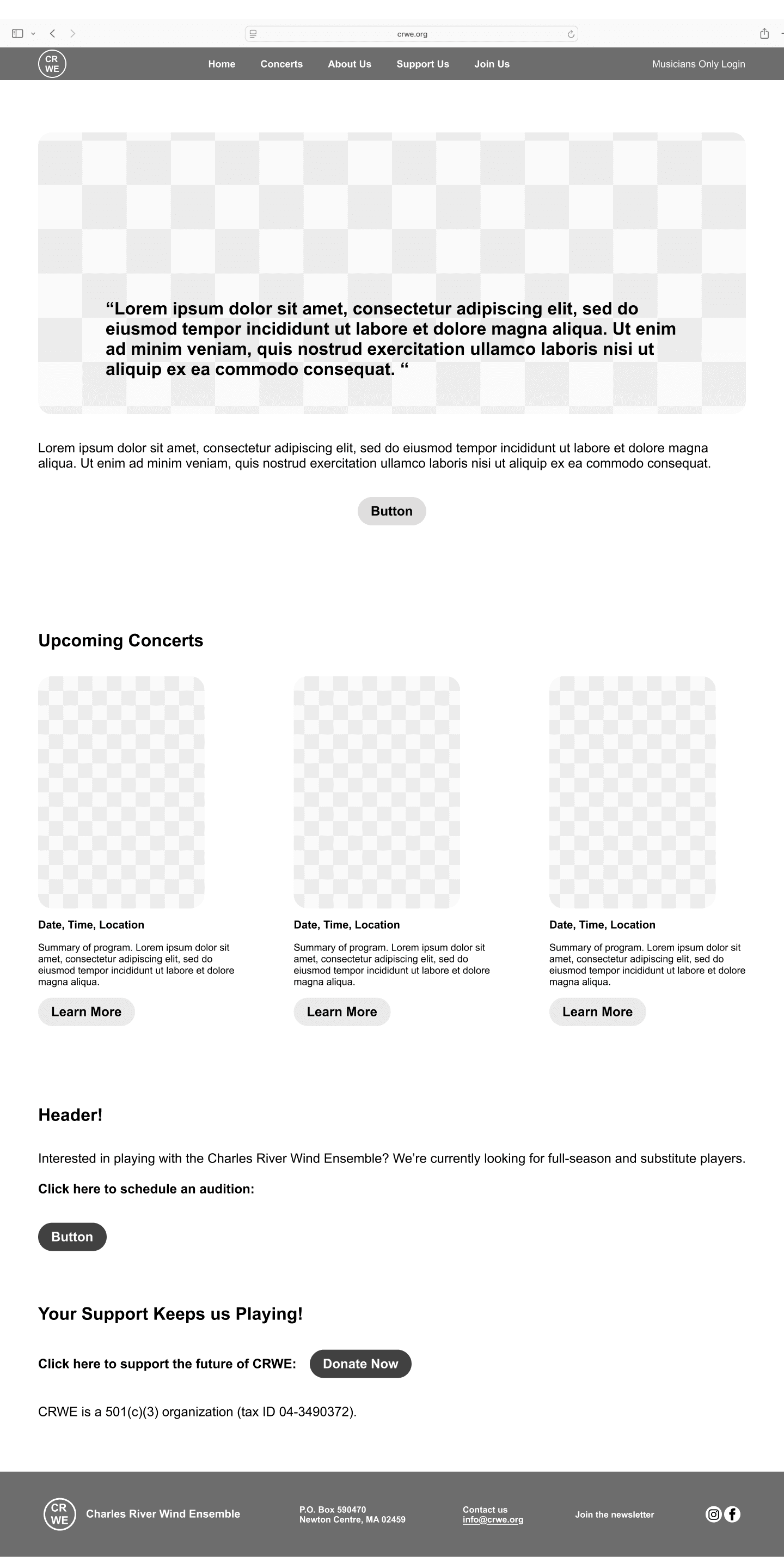 The Charles River Wind Ensemble (CRWE) is a nonprofit musical group with over 26 years of history, serving musicians, board members, audiences, donors, and prospective members. Their website was outdated, difficult to navigate, and did not clearly communicate key information or calls to action.